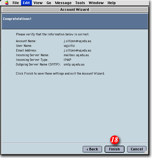 | 18) Review the details of the account you have set up. If all the information is correct click the [Finish] button. If not, click the [Back] button to make changes as necessary. |